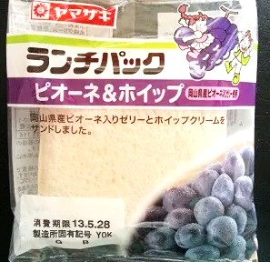 今回のランチパックは、2013年5月に発売された ピオーネ&ホイップ です。ピオーネって関東地方ではあまりなじみがありませんが、岡山県産の大粒のぶどうです。ピオーネの由来については、岡山県のホームページをご覧いただくと詳しく載ってます。なのでここでは説明いたしませんが、1つだけ特徴を言うと、糖度が16度以上の甘さがあり、これは是非食べてみたいですね。岡山県に行くと、ご当地限定レトルトカレーに、このピオーネの入ったカレーが売られてます。糖度16度の甘さとカレーの組み合わせ・・・?やっぱりランチパックの方が美味しいでしょう。イタリア語で「開拓者」という意味のピオーネ。ランチパックという新しい開拓地で、ピオーネの味を食べてみたいと思います。