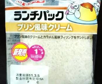 今回のランチパックは、2011年3月に発売された プリン風味クリーム です。実は2009年11月に一度、 ランチパック プリン風味クリーム が登場しています。その時はお笑いコンビとのコラボで、パッケージにサンドウィッチマンのイラストが描かれていました。そしてランチパックの中にプリン風味のクリームが入ってます。
