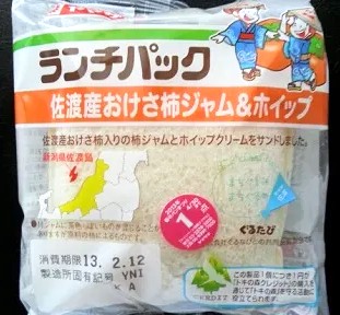 今回のランチパックは、2013年2月に発売された 佐渡産おけさ柿ジャム&&ホイップ です。新潟県佐渡市といえば、新潟港から水面を浮上して走るジェットフォイル に乗り、1時間ちょっとで佐渡両津港に着きます。この方法が一番早く佐渡に行けますが、車の場合はカーフェリーを利用します。この場合三種類のフェリーがありますが、その中にも「おけさ」の名前が付くおけさ丸があります。そしておけさ節佐渡おけさは、佐渡を代表する民謡音楽として有名ですね。そんな佐渡の名物のおけさ柿ジャムランチパックで味わってみたいと思います。