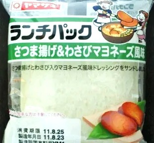 今回のランチパックは、2011年8月に発売された さつま揚げ&わさびマヨネーズ風味 です。なんとランチパックにさつま揚げとは!また凄い具材を持って来ましたね。さつま揚げは美味しいけれど、これがパンに合うのかが問題です。そしてさつま揚げだけだと淡白なので、チョッと刺激のあるわさびマヨネーズ風味のドレッシングを加えてます。パッケージには「からみの苦手な方は注意してください。」と書かれてます。ほんと「わさび」と聞いただけで、頭がツーンとなります。食べる人を限定してまで、ヤマザキさんも冒険しましたね。そんな酒のつまみのようなランチパックを食べてみる事にします。