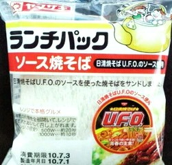 今回のランチパックは、2010年7月に発売された ソース焼そば です。最近他社の製品とコラボしたランチパックが登場していますが、まさかあの日清さんとコラボするとは驚きました。それも日清焼そばU.F.O.ですよ。ランチパックではカレー焼そば・富士宮焼そばなどのソース焼そばシリーズが販売されましたが、ソース焼そばに関してはもうネタ切れと思っていました。今回のランチパックの登場で、「なるほどそう来たか」と感心の一言です。これは期待していいのかな?では早速食べてみる事にしましょう。
