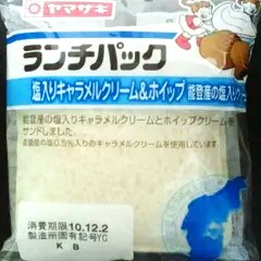 いつものようにランチパックの袋を開け、中から1枚取り出しました。そしてランチパックの角をひとかじりすると、中からキャラメルクリームが現れました。それに寄り添うように白いホイップクリームが見えます。でも普通のキャラメルの甘さですが・・・?あっ!あれ?これ~どことなく塩っぽい雰囲気が感じられます。そもそも甘いものとしょっぱいものを一緒にして味わうのはどうかと思いますが。主はキャラメルなので甘さが真っ先に楽しめます。そしてその奥に塩の味が薄っすら感じます。そうか、塩が入っているおかげで甘さに変化が現れ、深みのあるキャラメルの甘さが味わえます。