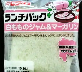 今回のランチパックは、2010年10月に発売された 白もものジャム&マーガリン です。白ももといえば、今年8月に岡山県産清水白桃を使ったランチパックをお伝えしました。その時は清水白桃をゼリー状にし、ホイップクリームと一緒になって、おもしろい食感のランチパックになっていました。そして今回は、山梨県産の白ももジャムを使い、ホイップクリームではなくマーガリンと一緒にしました。時々ジャムとマーガリンの組み合わせたランチパックが登場します。ジャムの種類にもよりますが、これがなかなかいい感じです。さて白ももジャムとの相性はどうでしょうか?では早速食べてみる事にしましょう。