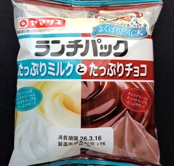 今回のランチパックは、2026年3月に発売された たっぷりミルク たっぷりチョコ  です。パッケージの右上に、「2つのおいしさが楽しめる・よくばりPACK 」の文字がある、これと似た 2つの味が楽しめるシリーズ とは少し違う組み合わせになっています。一目でわかる違いが、パッケージが左右にセパレートされてるデザインで、今回は左が たっぷりミルク で、右が たっぷりチョコ になっています。この2つの共通点は、タイトルをみておわかりのように「たっぷり」の文字で、これはすごく楽しみですね。では早速食べてみる事にしましょう。