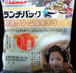 いつものようにランチパックの袋を開け、中から1枚取り出しました。そしてランチパックの角をひとかじりすると、中から白いクリームが現れました。滑らかな豆乳クリームの中に、きな粉の微妙にザラザラとした舌触りと、豆乳の風味&きな粉の甘さがとてもいい感じです。豆乳クリームに、京にんじんの味は感じられませんでしたが、でも上品でなんとも贅沢なランチパックが味わえました。パッケージに「舞妓はんのおやつ」とあるように、宮川町の君波さんお薦めだけのことはあります。