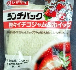 いつものようにランチパックの袋を開け、中から1枚取り出しました。なんとなくいつものイチゴジャムのランチパックより、若干厚みがあるようにも思えます。そのランチパックの角をひとかじりすると、うわわ!イチゴジャムが溢れ出てきました。見かけどおり、イチゴジャムがいっぱい入っていたのです。もちろんホイップも見えますが、イチゴジャムの量がいつもより多く、ホイップの存在が薄れています。食べ進むにつれ、イチゴジャムの甘さがしつこく思えてきました。それよりなにより、イチゴジャムがこぼれ落ちないか気になります。あらら、そう言ってる先から、案の定イチゴジャムが落ちてしまいました。皆さん食べる時は気をつけて下さい。