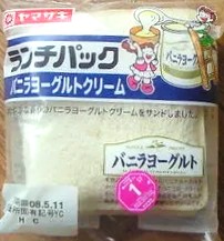 いつものようにランチパックの袋を開け、中から1枚取り出しました。う~ん・・甘酸っぱい香りが、ほのかに漂って来ました。そしてランチパックの角をひとかじりすると、アッ!ヨーグルトだ~。しっかりとパンの中に納まっていて、食べた口から垂れてくるわけでもなく、結構いい舌触りです。それにバニラの香りといい甘さといい、ヨーグルトに加わり美味しさを盛り上げていました。食べ終えた感は、サッパリとしていて、とてもいいです。しかしこのバニラとヨーグルトの組み合わせのアイデアは、とても面白いですねヤマザキさん!