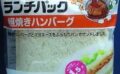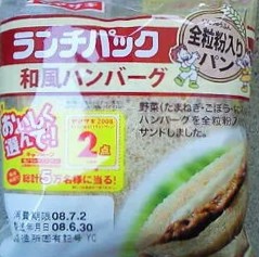 いつものようにランチパックの袋を開け、中からいつもと色合いの違う全粒粉入りのパンを1枚取出しました。そしてランチパックの角をひとかじりすると、ハンバーグが顔を出しました。野菜(たまねぎ・ごぼう・にんじん)入りのハンバーグの歯応えは少し硬めですが、肉肉らしい味をだしています。そこに甘辛い白いソース(マヨネーズ風?)が加わり、この和風ハンバーグをより一層美味しく引き立てています。うん!これは美味しいですね。なぜ全粒紛入りのパンを使うのかは調べていませんが、濃い味のハンバーグによく合います。これなら、野菜嫌いの人やお子さんにも、美味しいく食べられると思います。
