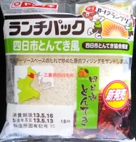 今回のランチパックは、2013年5月に発売された 四日市とんてき風 です。B-1グランプリには、年々多くの名物料理・ご当地料理が登場します。その度、出品された名物料理が、ランチパックに取り上げられて来ました。何がいいって、必ずしもグランプリで優勝した物だけでなく、「これぞ」と思われる名物料理をランチパックにしてます。で今回は、近年B-1グランプリに参加した、三重県四日市市で古くから食べられている、四日市とんてきのランチパックです。では早速四日市とんてき協会推奨の ランチパック 四日市とんてき風 を食べてみる事にしましょう。
