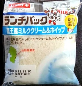 今回のランチパックは、2012年11月に発売された 蔵王産ミルククリーム&ホイップ です。皆さん蔵王のイメージは、スキーと樹氷と温泉・・・でしょうか。温泉はともかく、スキーと樹氷は冬の風物詩ですね。現在は東北新幹線もあるし高速道路もあるので、結構気軽に行けます。でもちょっと待って下さい。このルートで行くのは宮城蔵王ですよね?でも今回のランチパックの蔵王は、山形県側の蔵王のことなのです!僕のイメージですが、宮城側より山形県側の方が雪も多く寒そうです。そこで育った牛さんの牛乳が入ったミルククリームのランチパックを食べてみたいと思います。