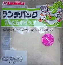 今回のランチパックは、2008年4月に発売された ずんだ&ホイップ です。「ずんだ」といえば、宮城県の名物としてずんだ餅があります。以前にずんだ餅を食べた事がありますが、緑色のあんがお餅に絡んでいました。その緑色のあんは枝豆をすり潰した物で、あんの中に粒粒の食感がありました。若干青臭さがありますが、僕はこの独特な食感と枝豆の香りが好きですね。それがランチパックになりました。では早速食べてみる事にしましょう。