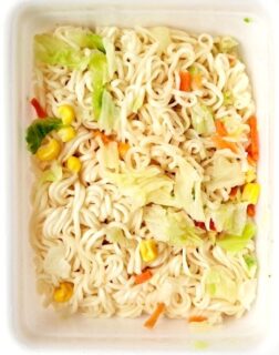 麺の上に、お湯で戻った キャベツ ・コーン・にんじん が見えます