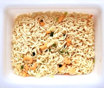 麺の上に、お湯で戻った えび ・ ねぎ が見えます
