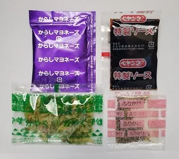 中に 特製ソース ・ からしマヨネーズ ・ かやく ・ ふりかけ の4つの袋が入っています