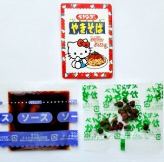 中に ソース ・ かやく の2つの袋と、ハローキティのオリジナルカードが入っています
