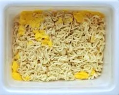 湯切りの穴から、お湯でやわらかくなった かやく のたまごが、ふわふわ流れ出てしまいました
