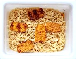 BIGではない小さいカツを、少し食べやすくする方法を発見。湯切りを慎重に行った為、容器の底にお湯が少し残っていて、これに カツかやく を浸すと、だいぶやわらかい食感になりました。