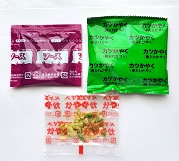 これらを取り出し、かやく を入れ、熱湯を注ぎます