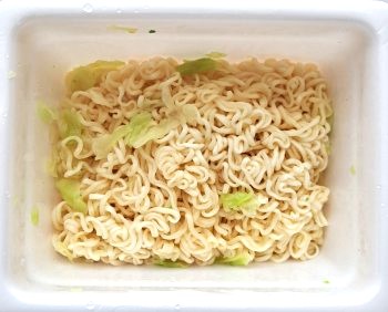 麺の上に、お湯で戻った キャベツ が見えます
