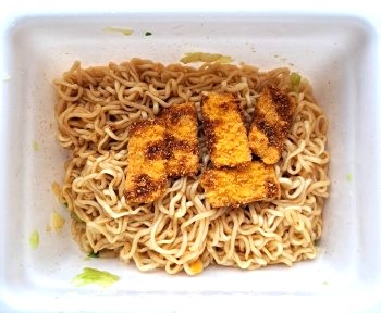 麺の上にのっている物が、 ソースかつ をイメージした カツかやく です