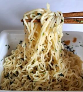 麺の上に、お湯で戻った フライドガーリック と パクチー が見えます