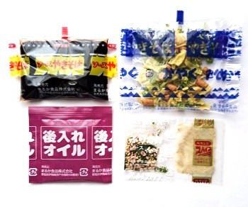 中に ソースやきそばかやく ふりかけスパイス 後入れオイル の4つの袋が入っています