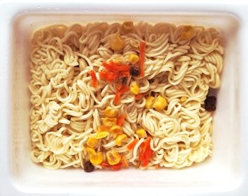 麺の上に、お湯で戻った コーンニンジン豚ひき肉 が見えます