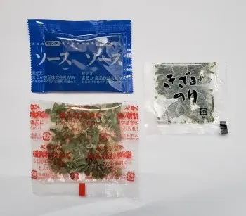 中に ソース 後入れかやく ・ きざみのり の3つの袋が入っています