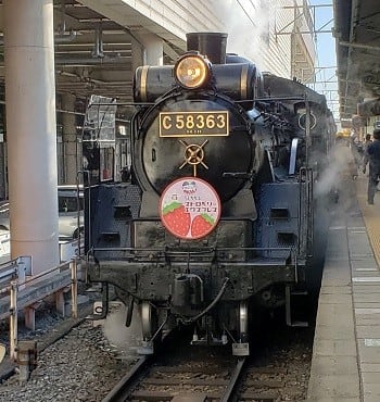 機関車の車両はいつもの C58363 ですが、SLのヘッドマークにいちごの絵柄が描かれていました。これは2年ぶりにお目見えした、SLちちぶストロベリーエクスプレです。